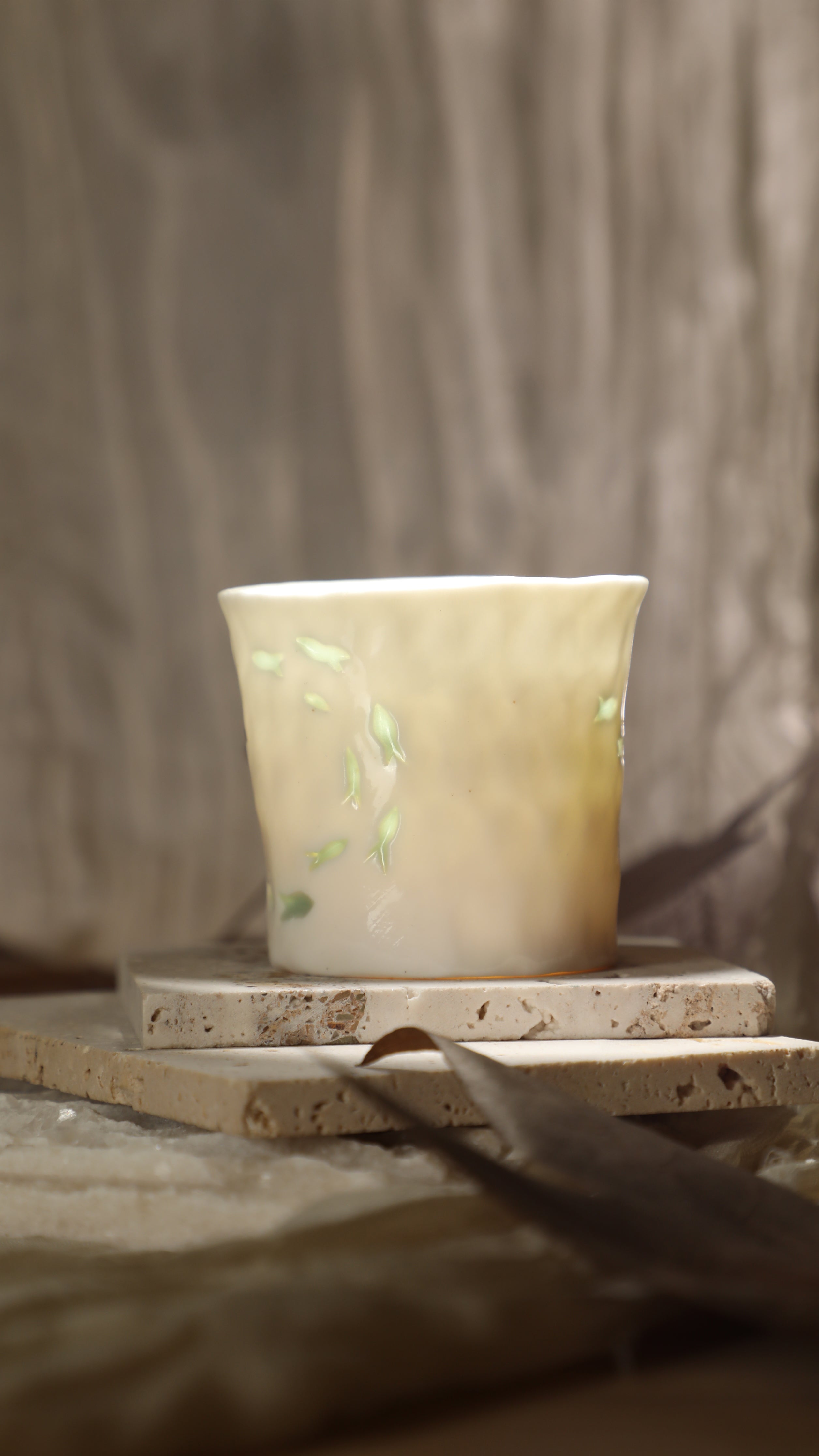 Hand-pinched and hollow-carved ceramic cup, finished with a translucent “linglong”“玲珑” glaze that softly glows when held against the light.