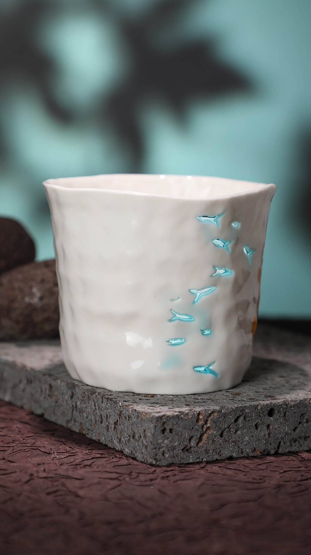 Hand-pinched and hollow-carved ceramic cup, finished with a translucent “linglong”“玲珑” glaze that softly glows when held against the light.