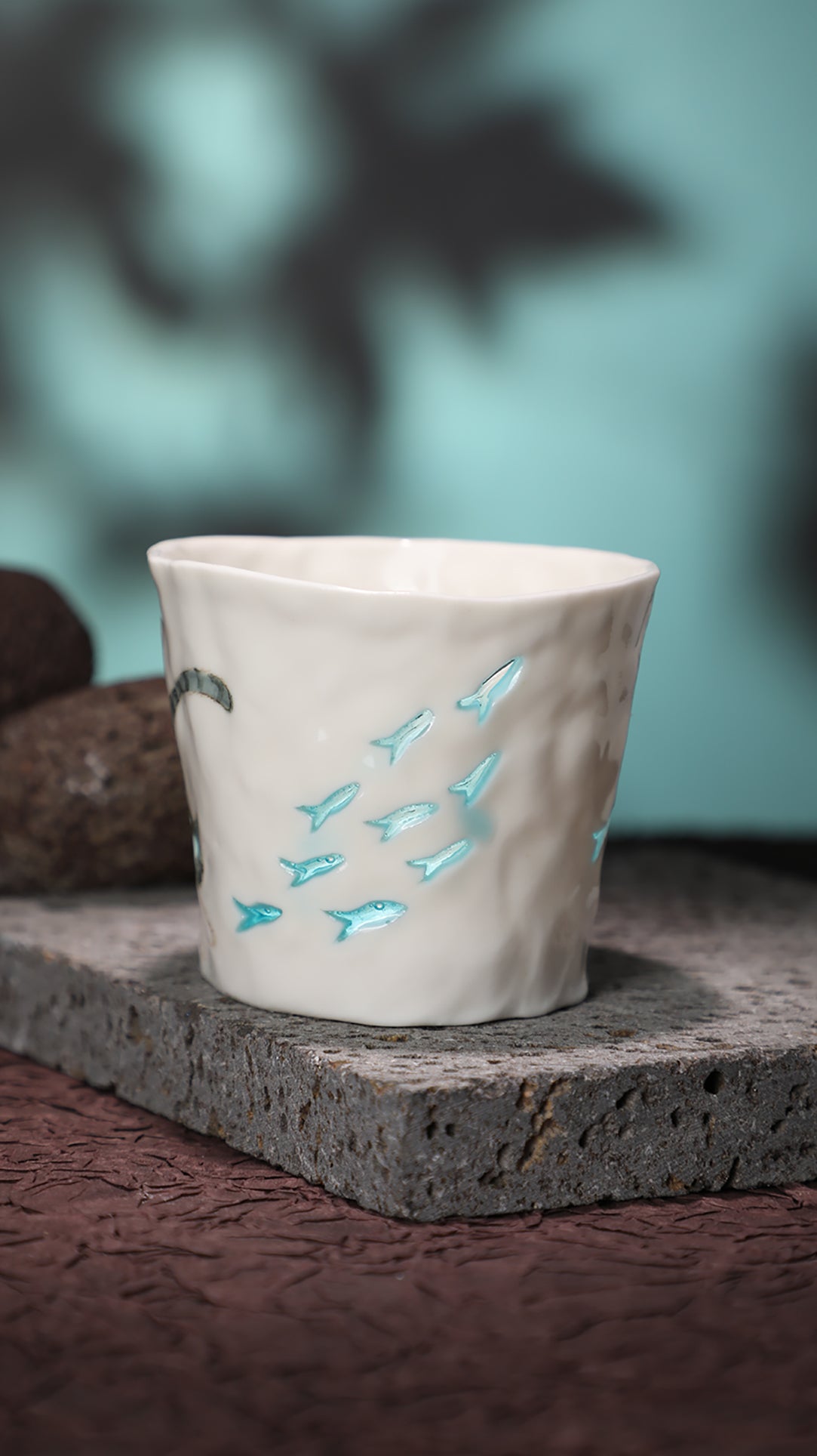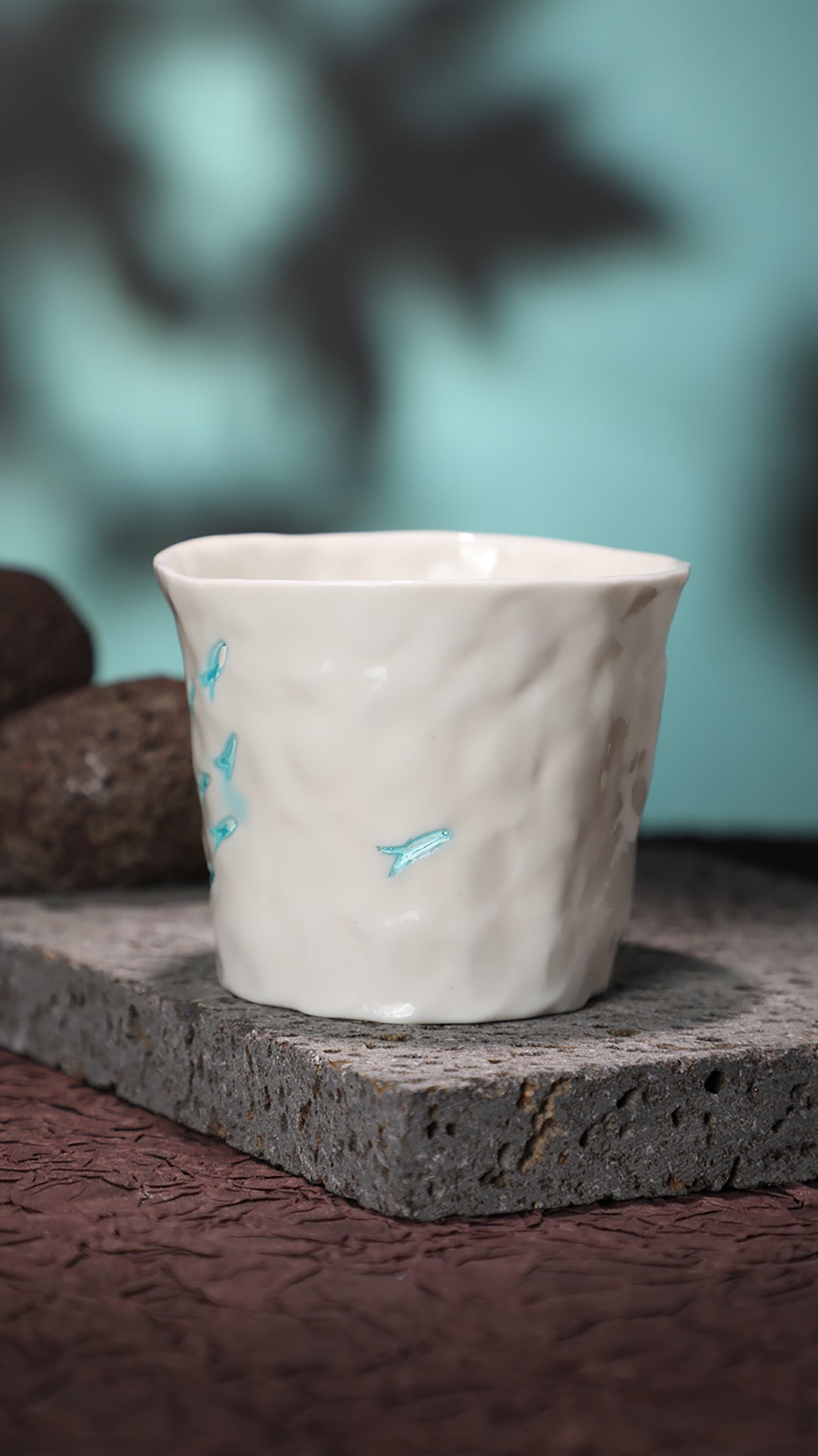 Hand-pinched and hollow-carved ceramic cup, finished with a translucent “linglong”“玲珑” glaze that softly glows when held against the light.