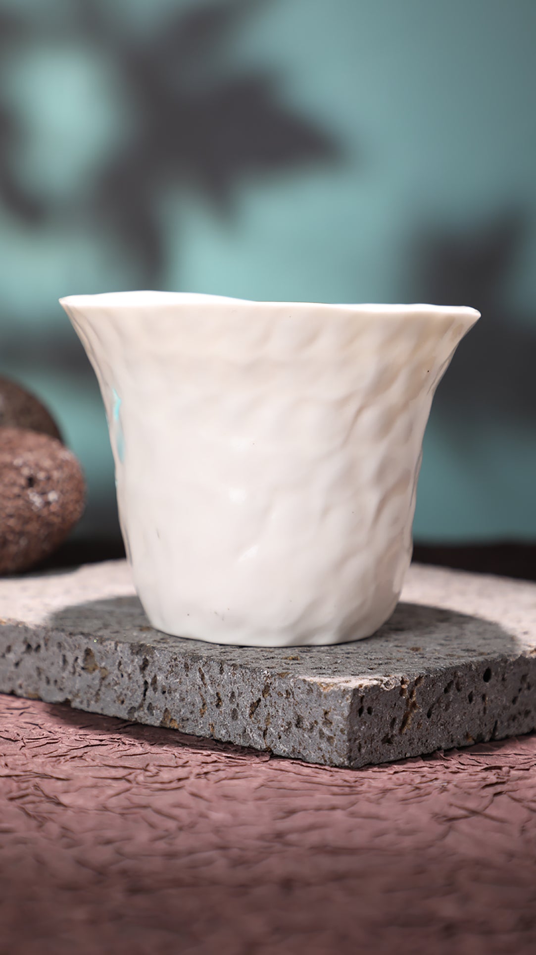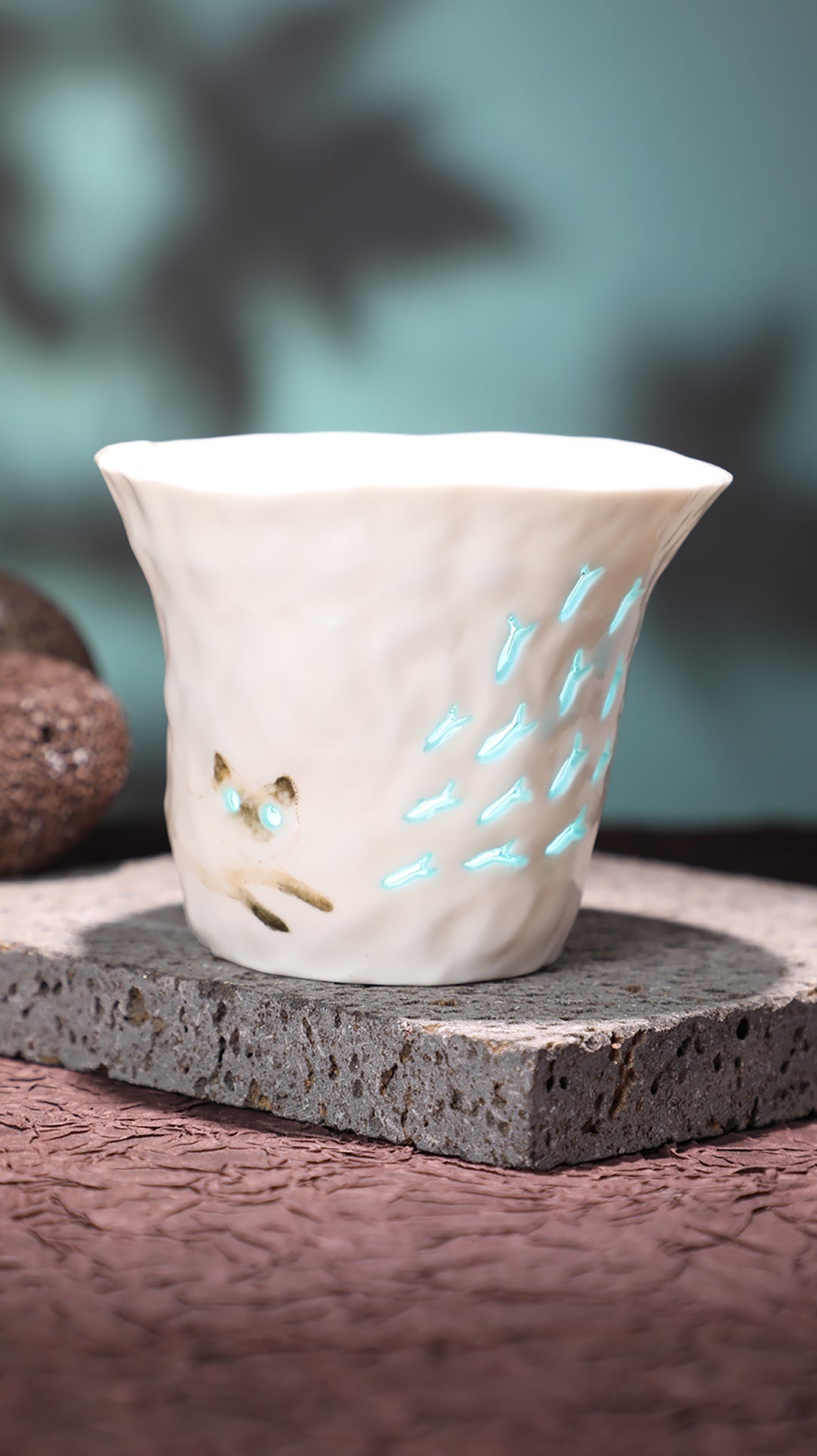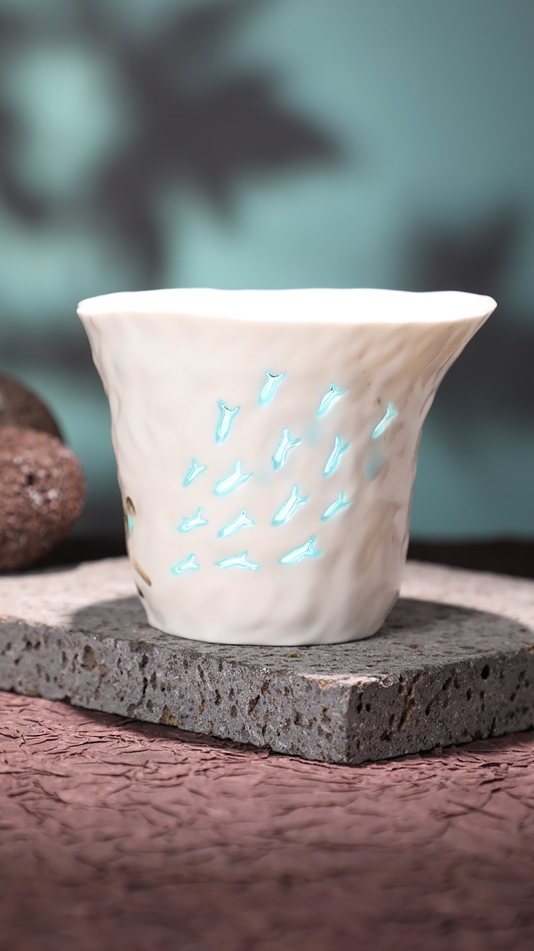 Hand-pinched and hollow-carved ceramic cup, finished with a translucent “linglong”“玲珑” glaze that softly glows when held against the light.